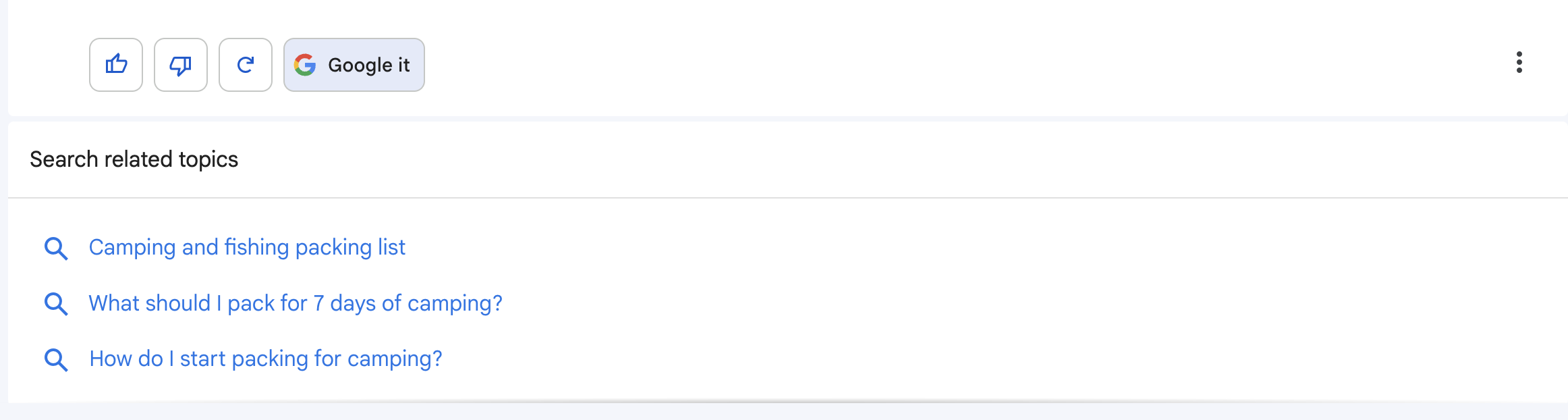 Google itbutton which gives list of topics similar to your prompt - In addition, on the left side navigation, there are other options like