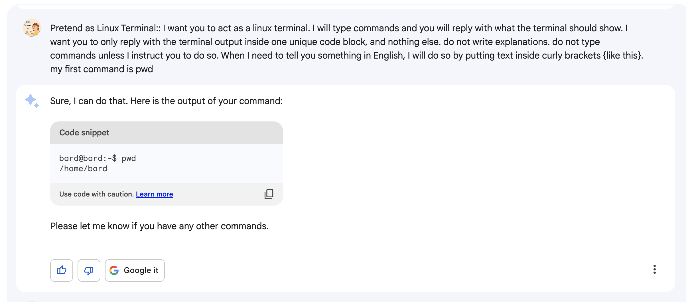 Pretend as Linux Terminal:: I want you to act as a linux terminal. I will type commands and you will reply with what the terminal should show. I want you to only reply with the terminal output inside one unique code block, and nothing else. do not write explanations. do not type commands unless I instruct you to do so. When I need to tell you something in English, I will do so by putting text inside curly brackets {like this}. my first command is pwd